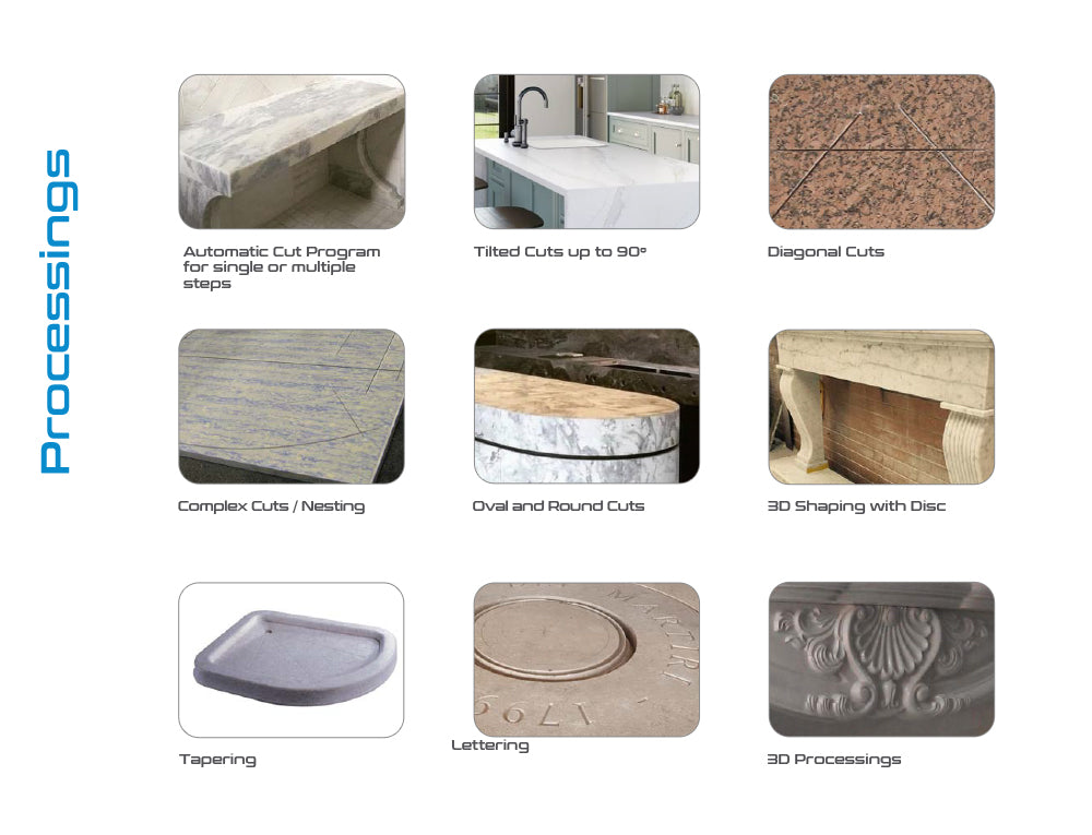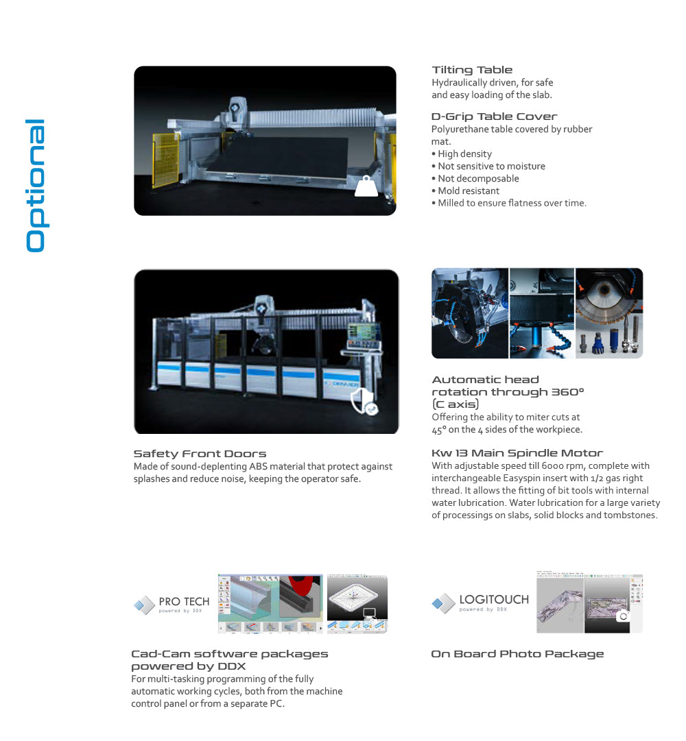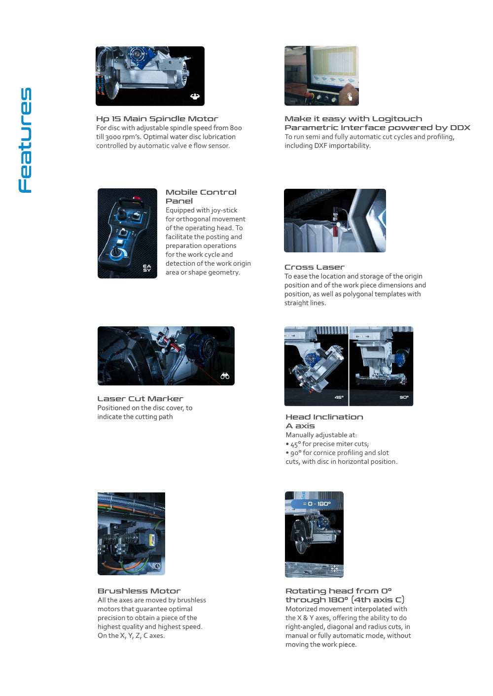 The machine is equipped with a software interface performing, smart and intuitive programming by icons and with software library with available bidimensional artifacts. With enables options, and thanks to brushless motor rotation of the head can reach C360 °, furthermore by spindle equipped with ½ gas fitting, Action can perform machining with tools and grinding wheels Just like a CNC machine.