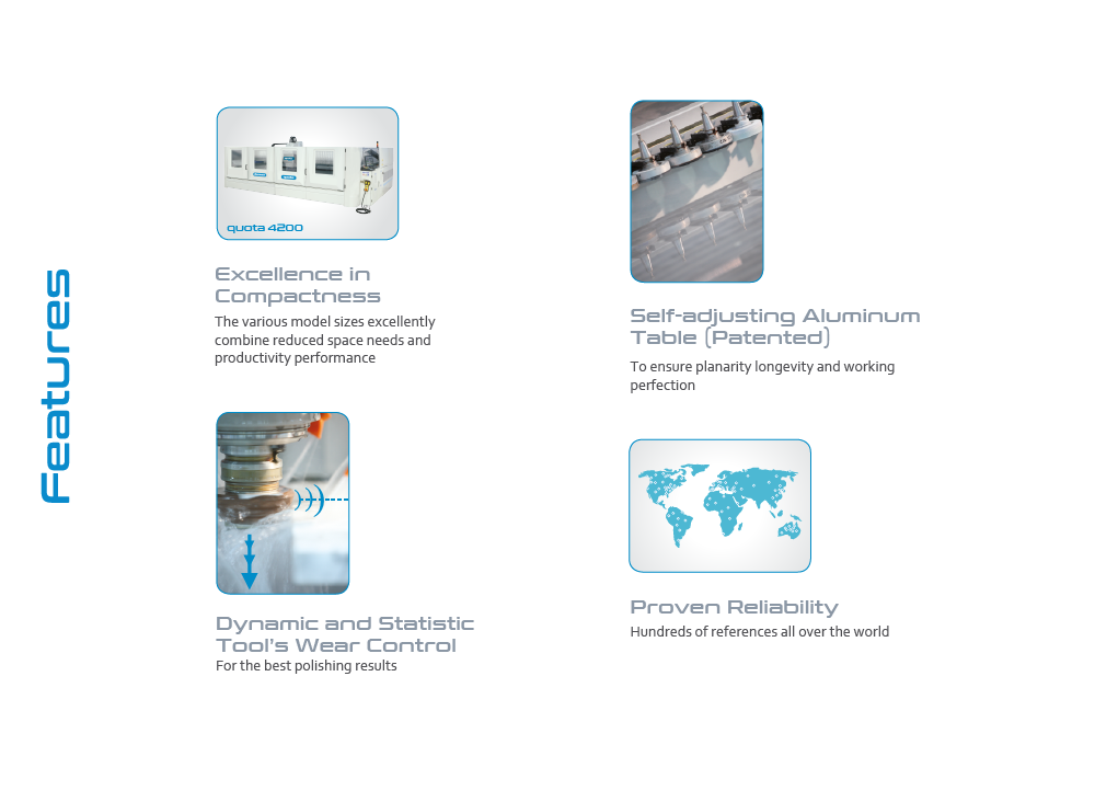 QUOTA Stone, thanks to its advanced ergonomics, features top class working area/machine footprint ratio allowing machining of mm. 3250 x 1550 sheets (with mm.100 tool diameter) in an extremely reduced space.