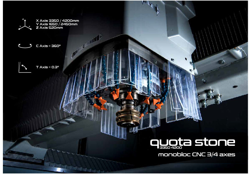 QUOTA Stone is a multifunctional CNC working center with 3 digital interpolated axes (4 axes opt). It features a powerful kW 10,2 (S6) air-cooled electrospindle specifically designed for outstanding lifetime. All axes motion is powered by brushless motors with accuracy ensured by prismatic steel guideways with 4 revolving balls pads protected by bellows.